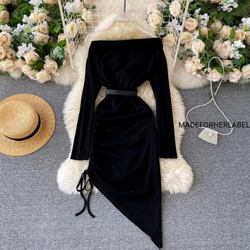 • This Aitana asymmetrical dress is perfect for any day out or party. Its black colour contrasts and compliments unique features like the stylish belt and bag, making it an elegant yet eye-catching choice.