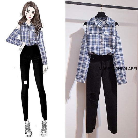 Cold Shoulder Checkered Shirt With Pants Set