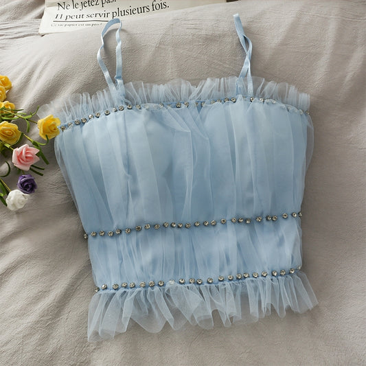 Gracy One Shoulder Polka Mesh Sleeve Corset Top