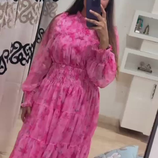 - Get ready to turn heads in this pink Turf Floral Maxi Dress! Perfect for any party, this non-revealing dress features full sleeves and a flattering maxi length. Stand out from the crowd and make a stylish statement with this unique piece.