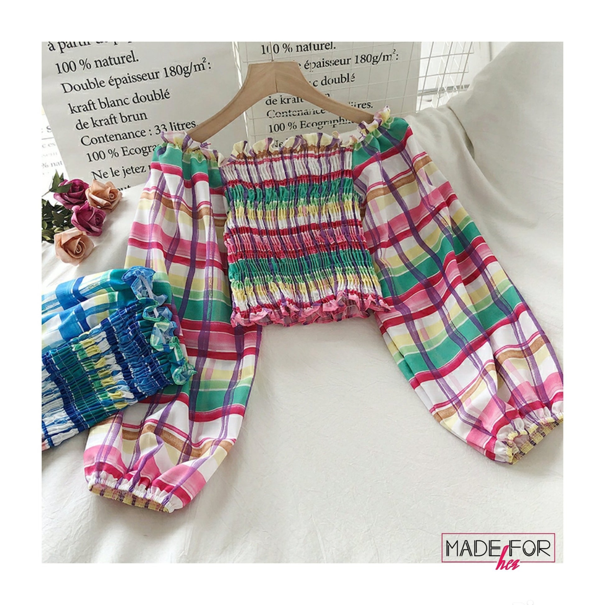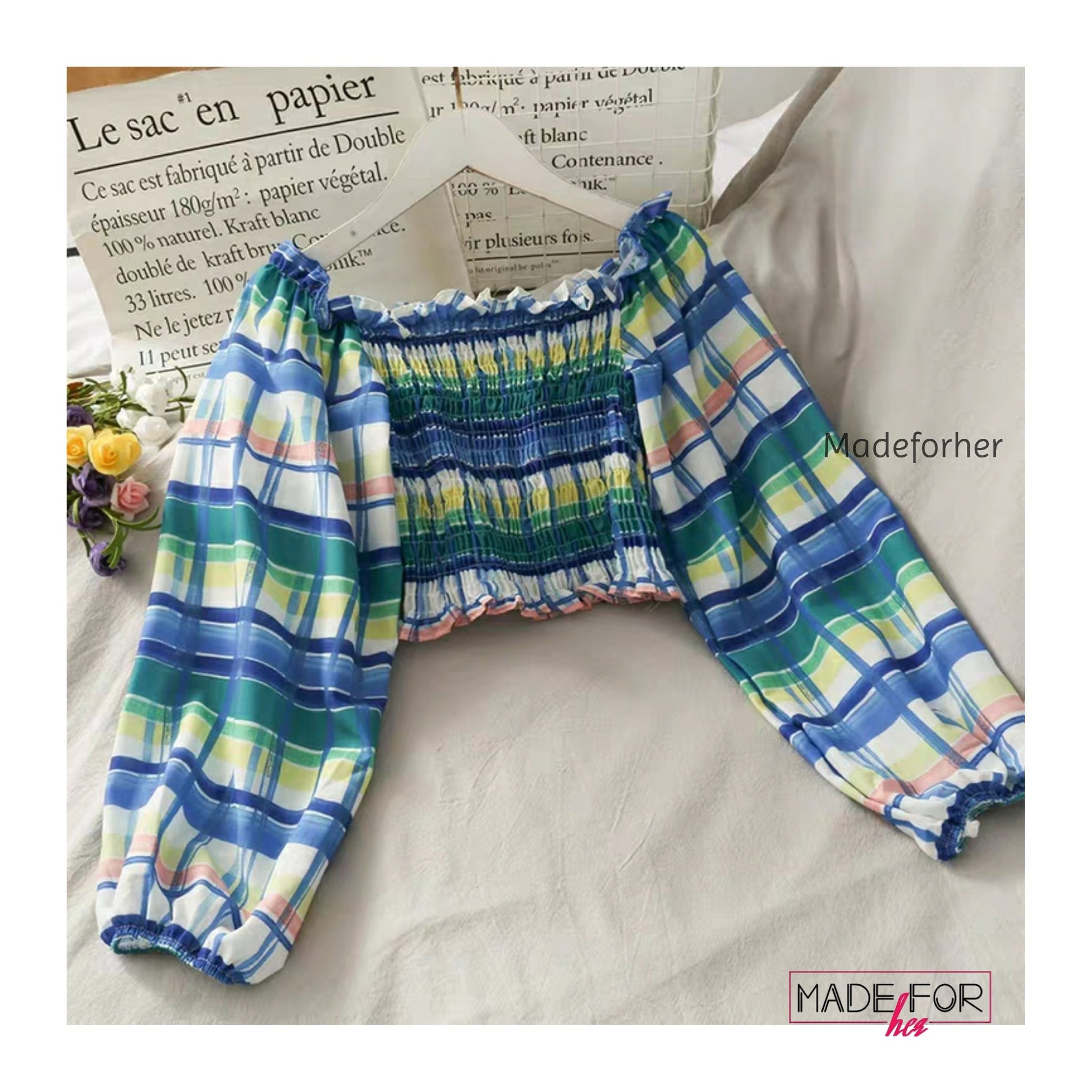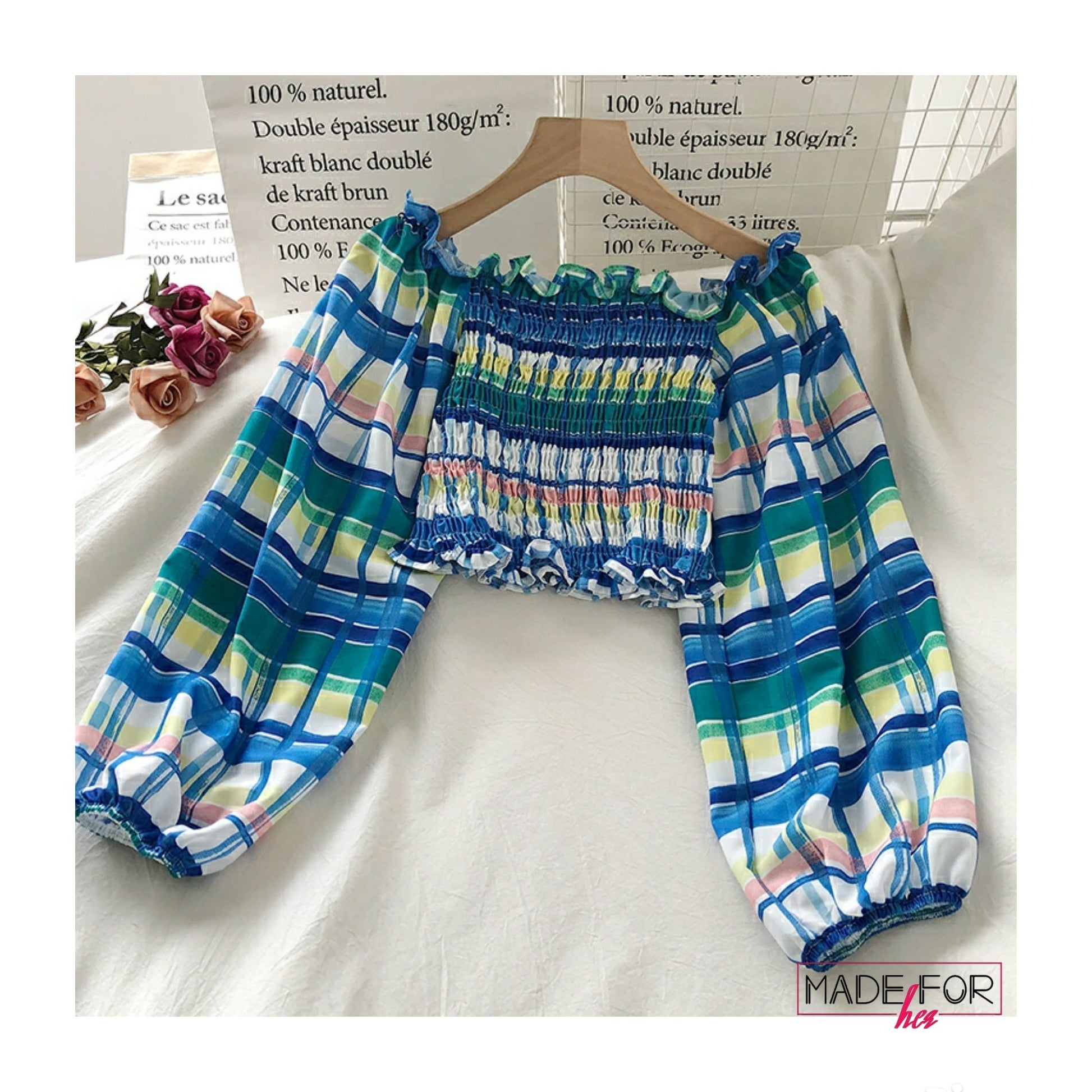 - Designed for the stylish and trendy, this Amanda Plaid Ruched Top is the perfect blend of sophistication and sassy. The off shoulder design and cropped length accentuate your figure, while the bold blue plaid pattern adds a touch of chic to any outfit. Take your fashion game to the next level with this must-have top.