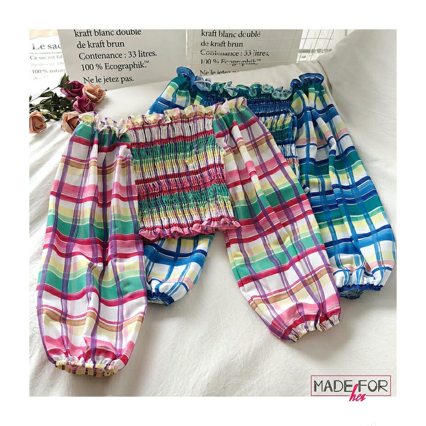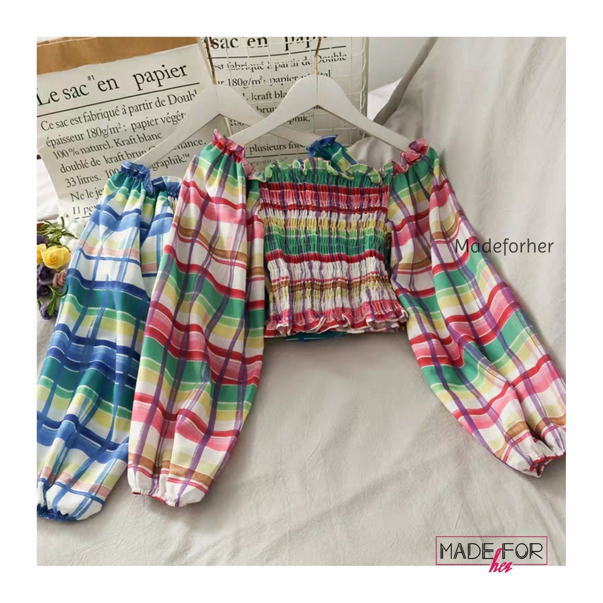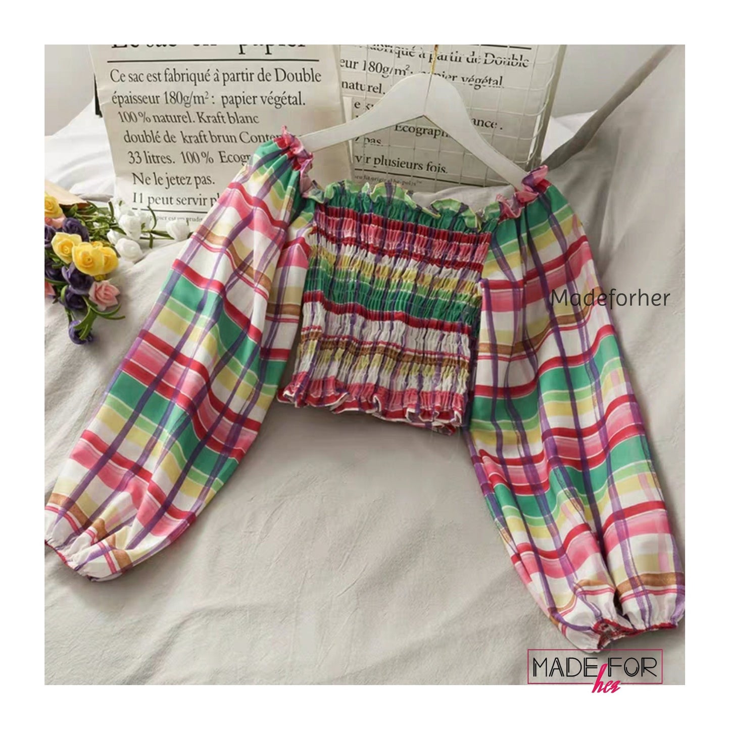 - Designed for the stylish and trendy, this Amanda Plaid Ruched Top is the perfect blend of sophistication and sassy. The off shoulder design and cropped length accentuate your figure, while the bold blue plaid pattern adds a touch of chic to any outfit. Take your fashion game to the next level with this must-have top.