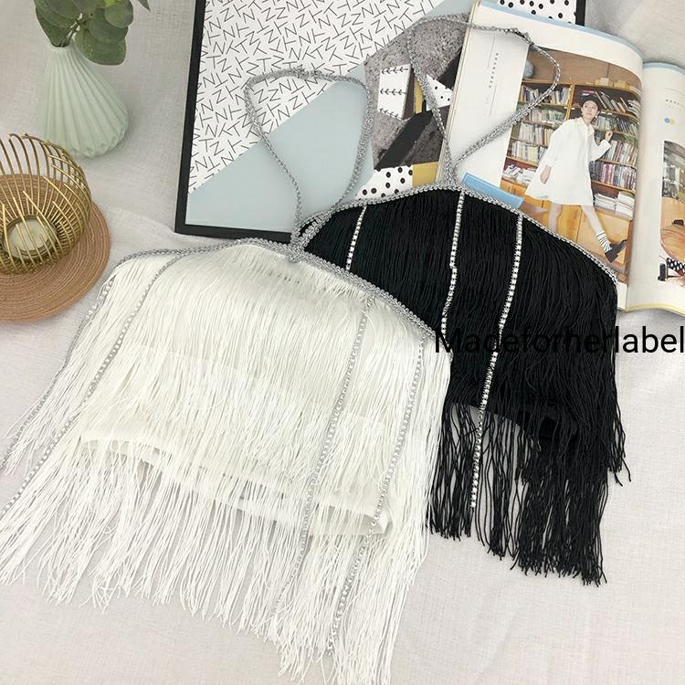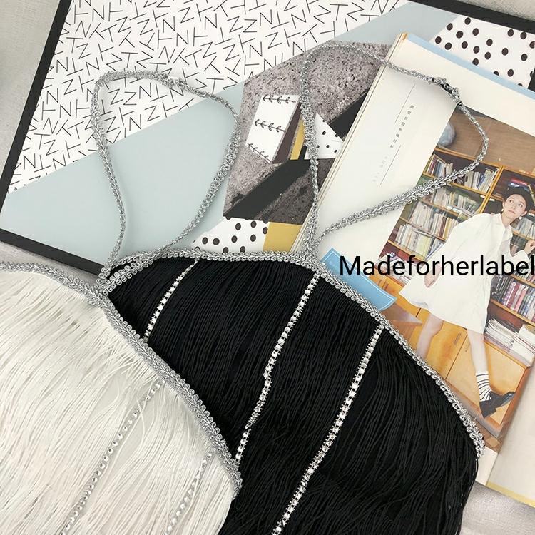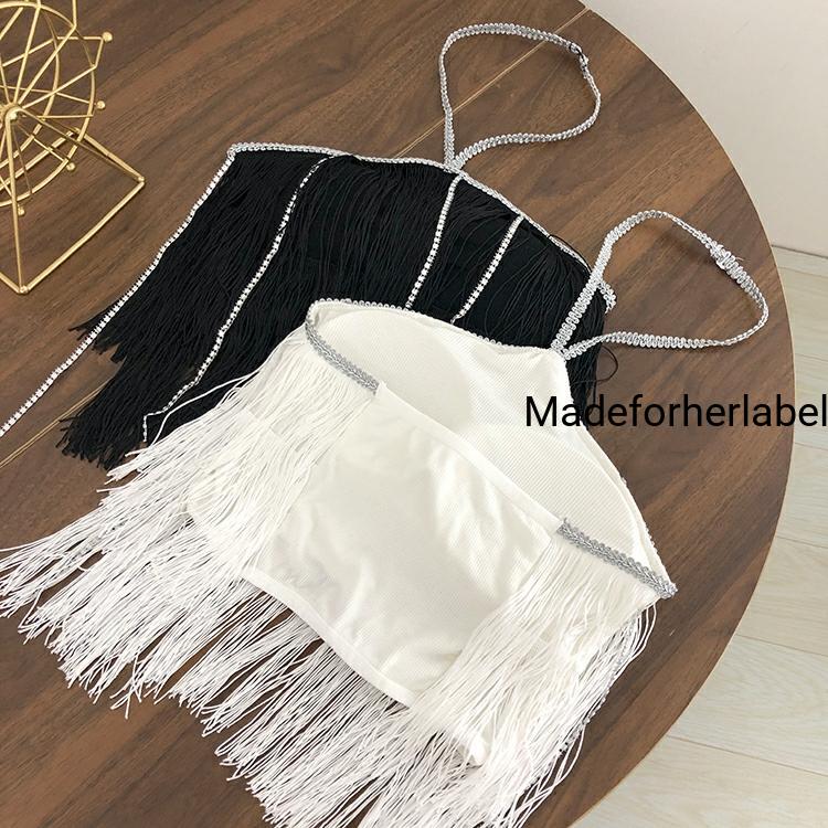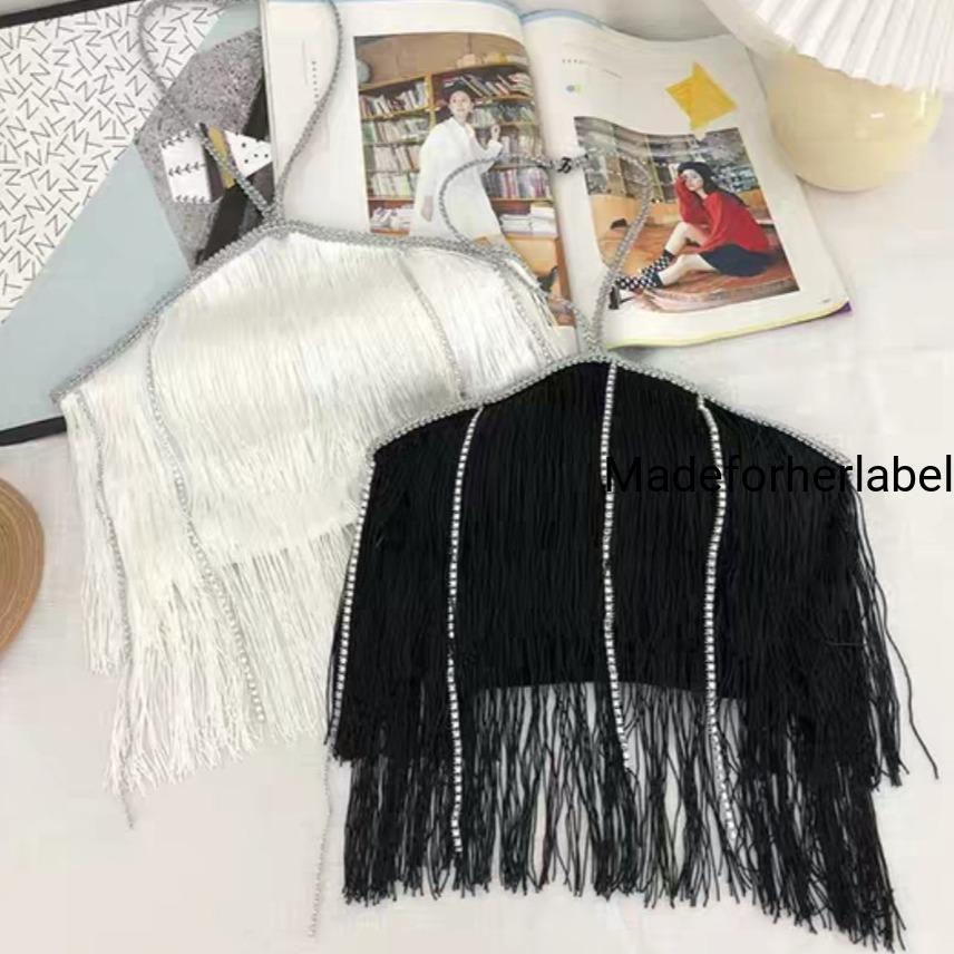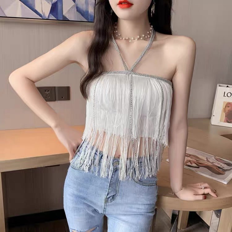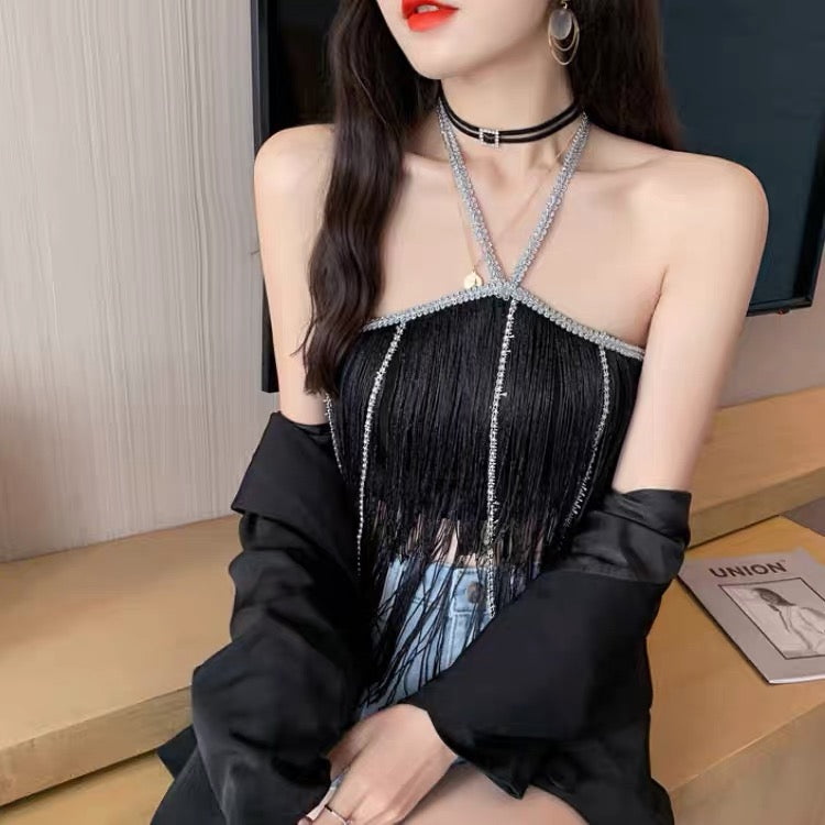 Introducing the Celia Rhinestone Fringe Top, perfect for adding a touch of glamour to any party outfit. Its fringe detailing and halter neck style make it a trendy and eye-catching crop top. Made for the fashion-forward, this top is a must-have for any special occasion.