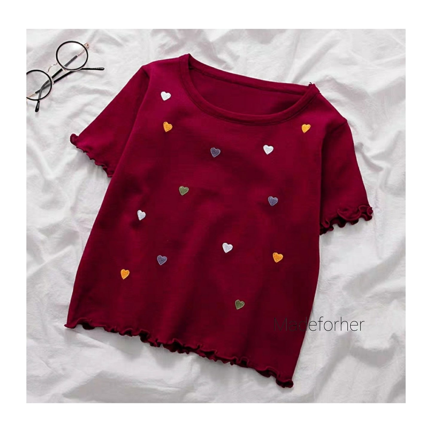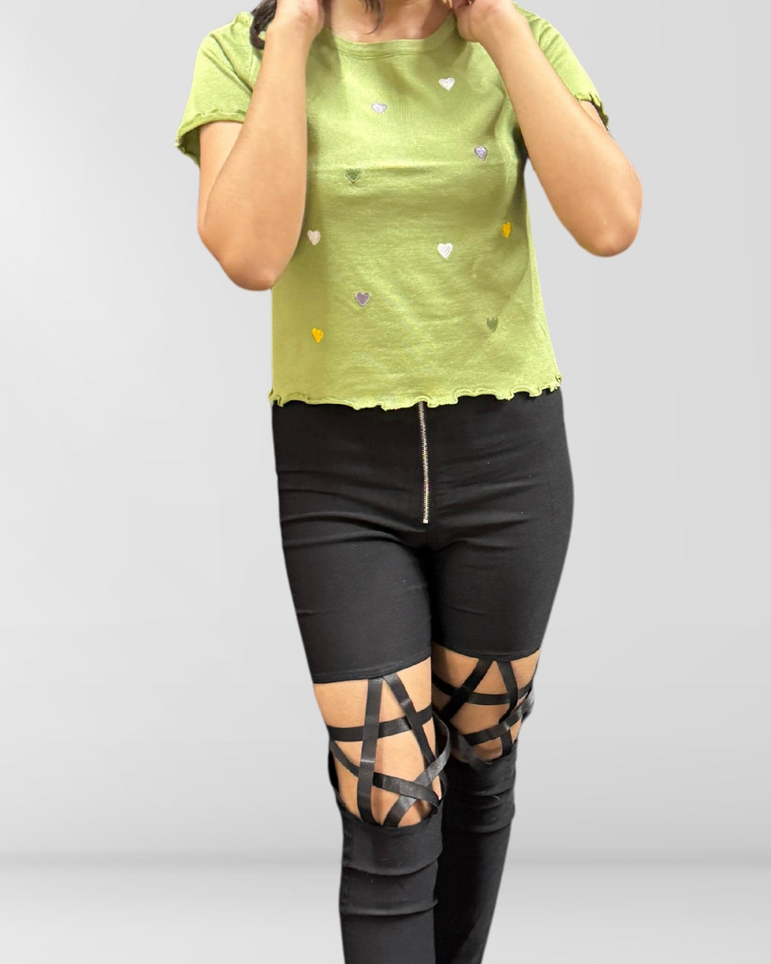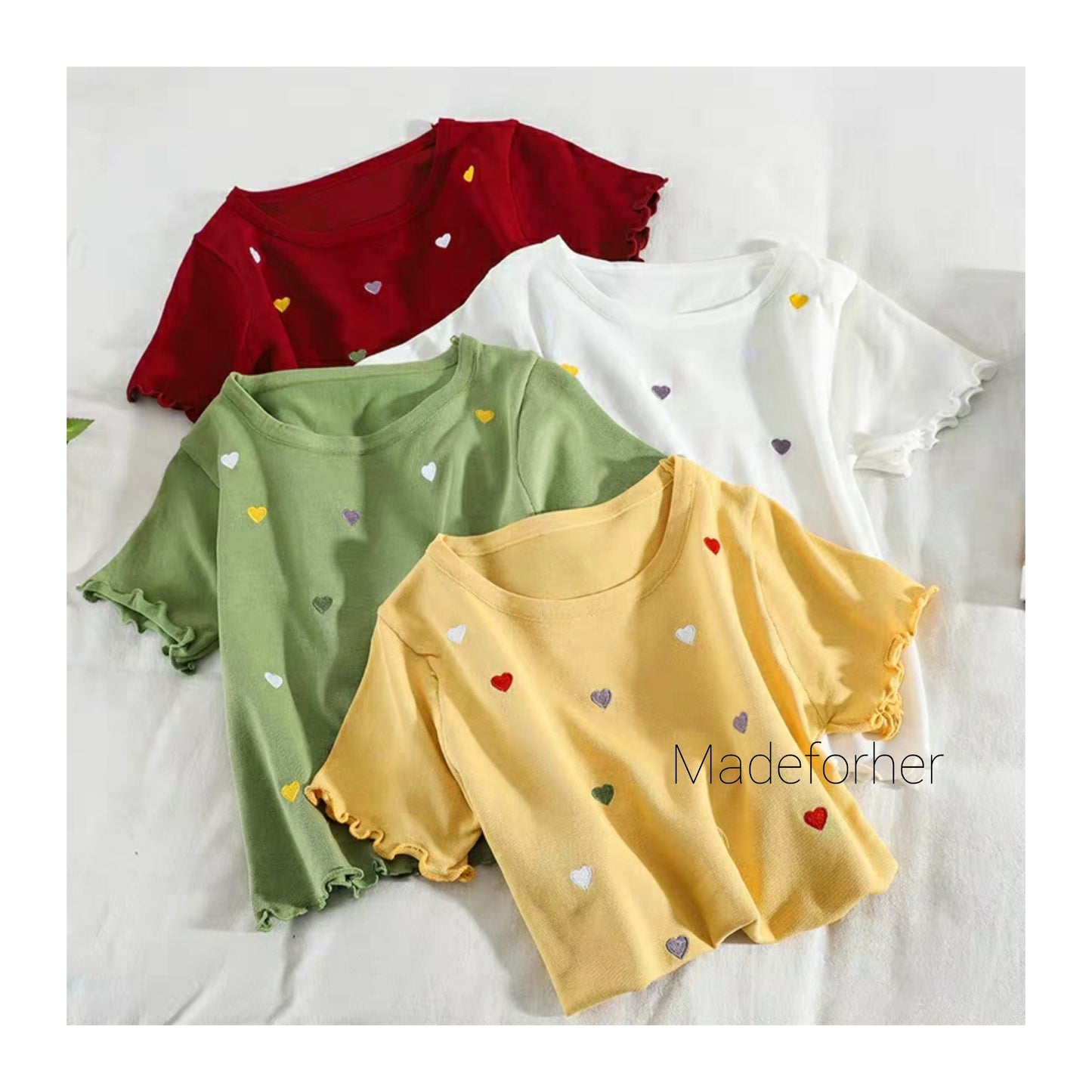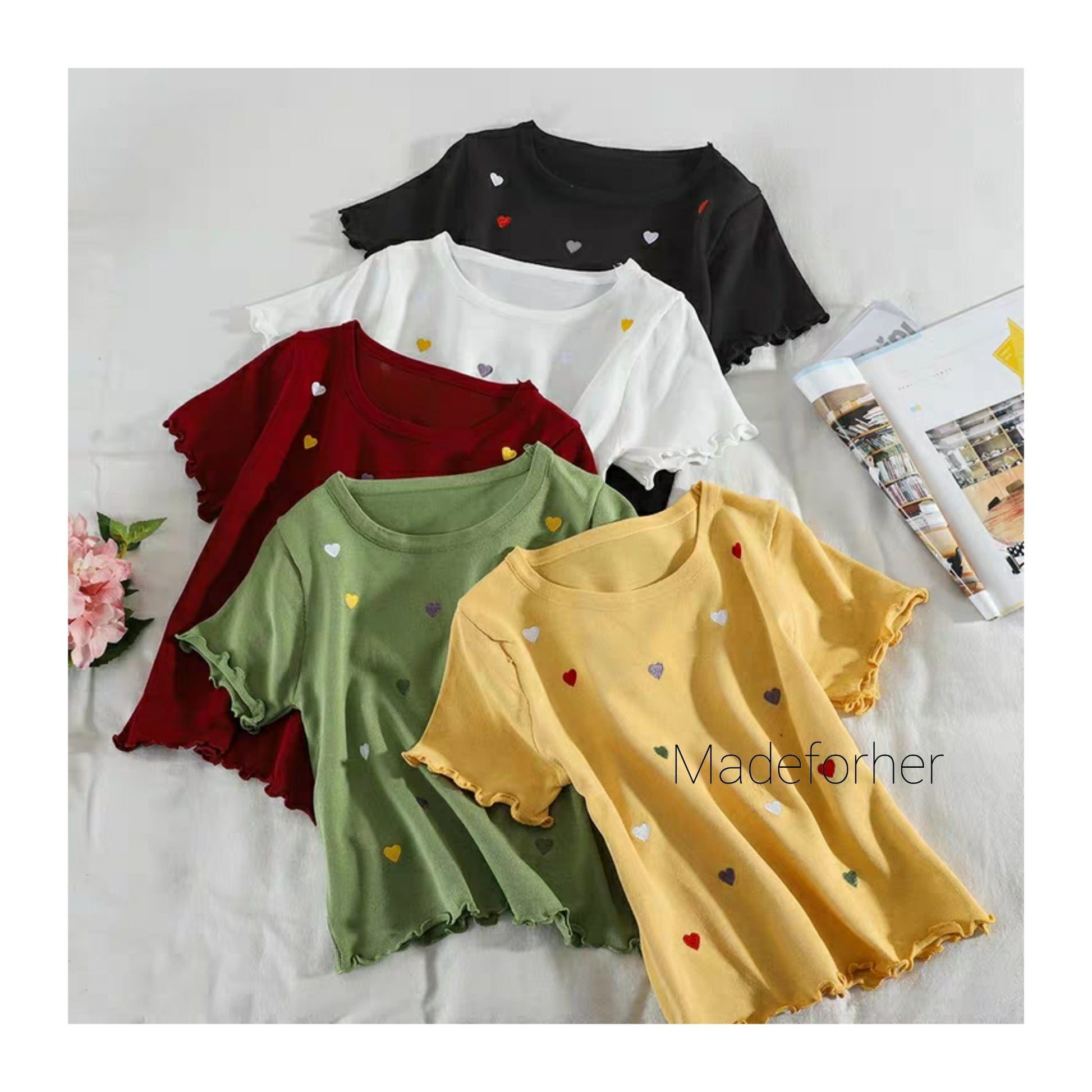 The Colorful Heart Tee features a unique heart patchwork design, adding a playful touch to the classic crop tee style. Made with high-quality materials, this tee is perfect for adding a pop of color to any outfit.