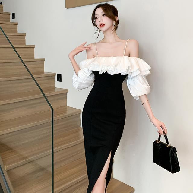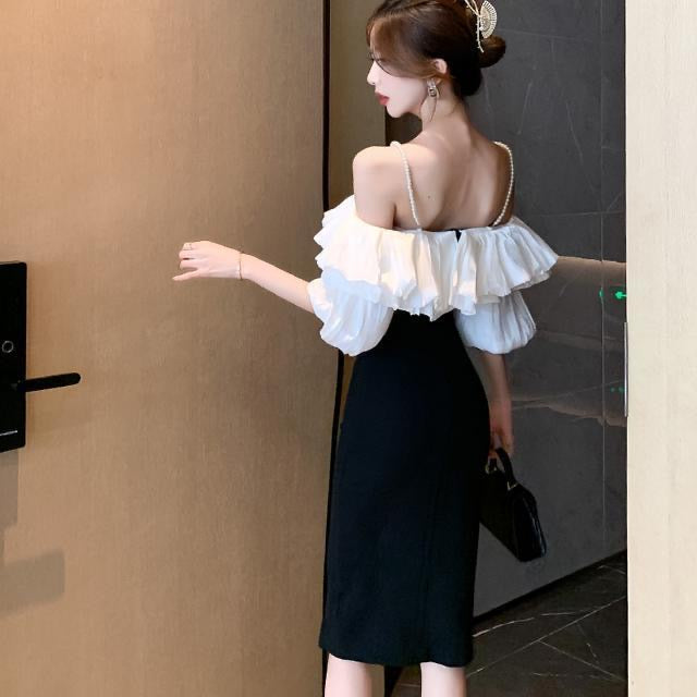 Get ready to party in style with the Katherine Pearl Strap Bodycon Dress! Made with a mix of polyester, cotton, and acrylic, this dress features a unique pearl strap and classic black bodycon silhouette, paired with comfortable, white sleeves. Perfect for both everyday wear and special occasions, this dress is a must-have in your wardrobe.
