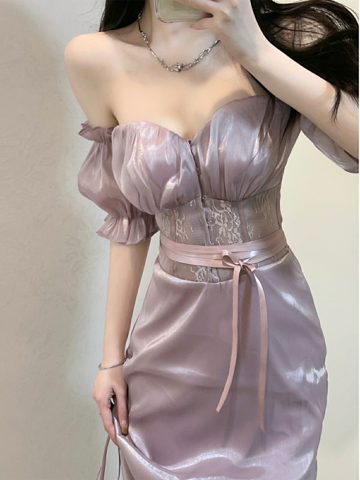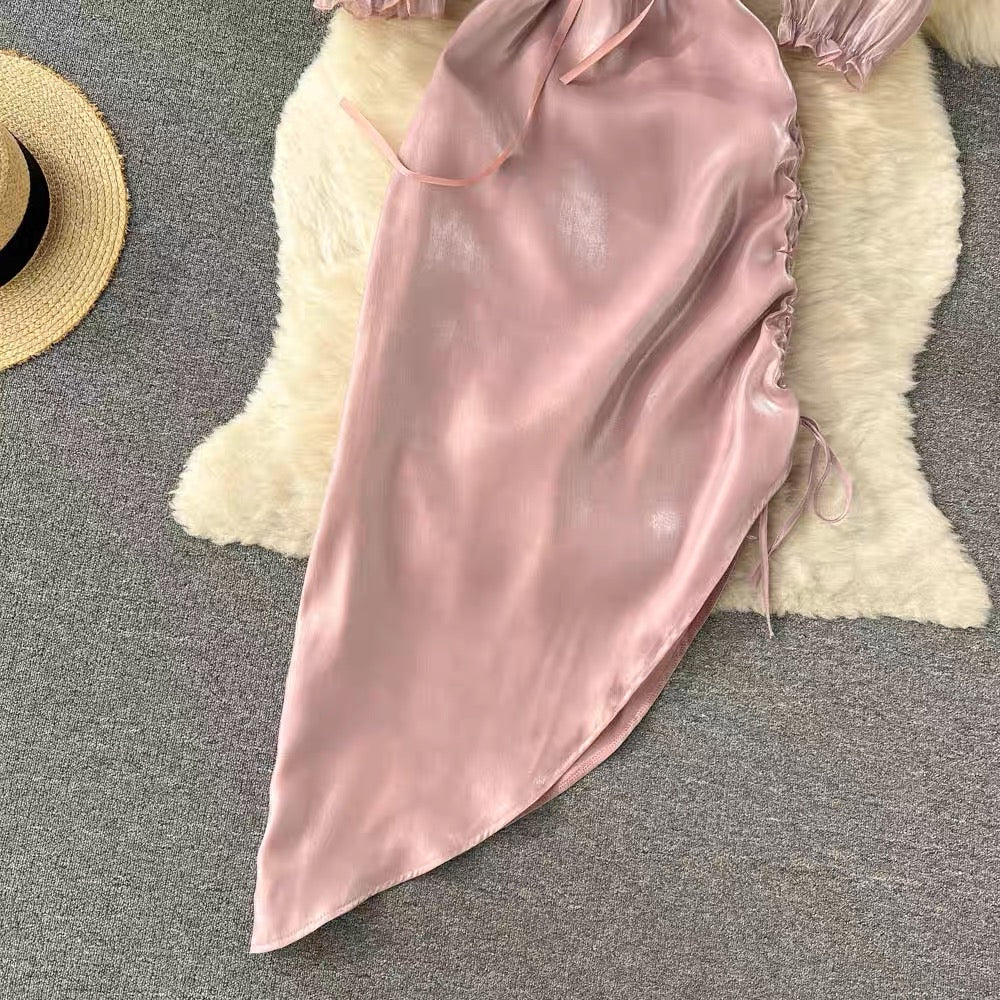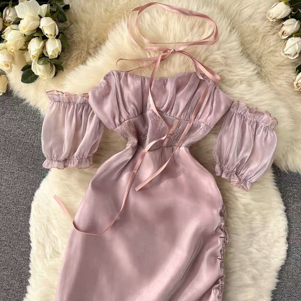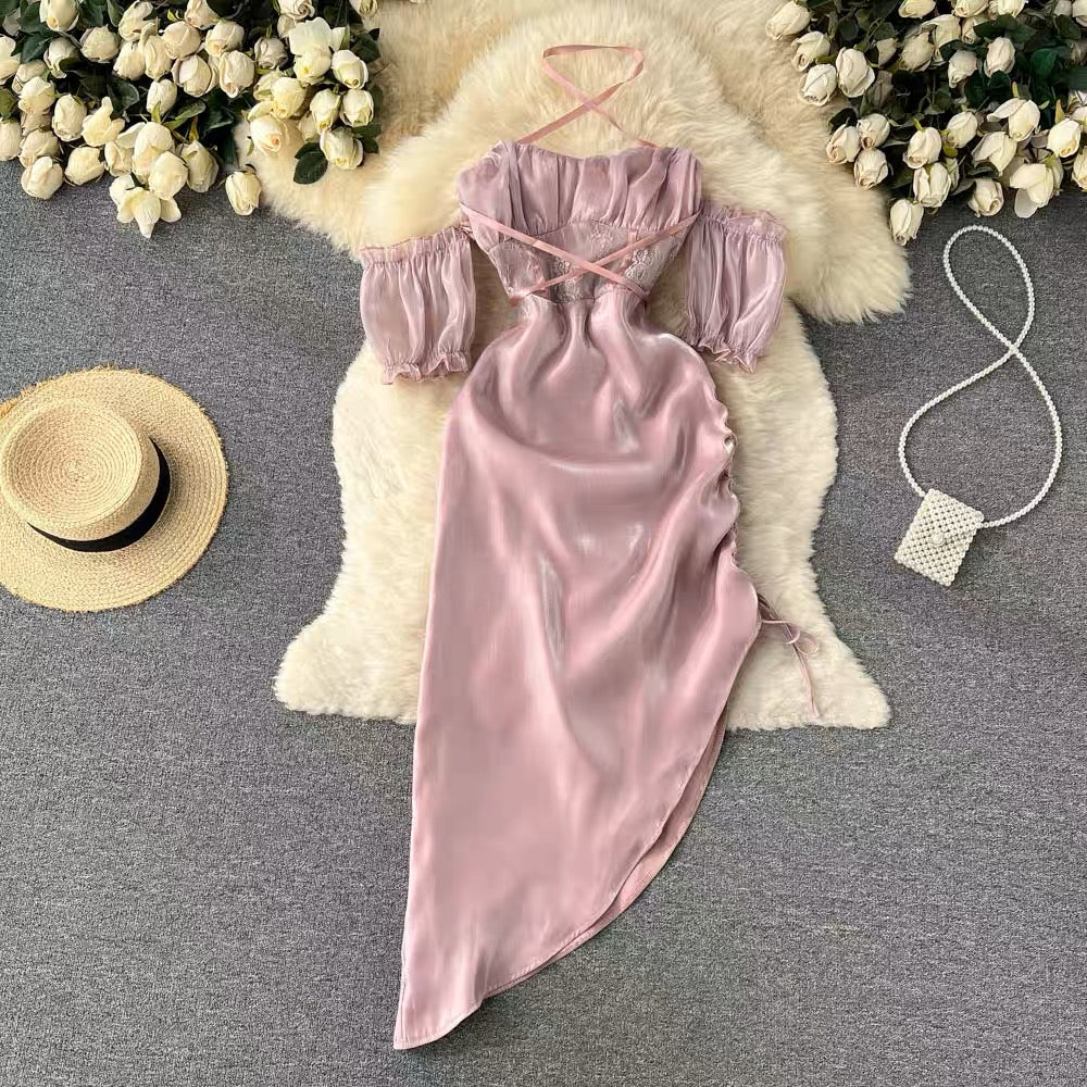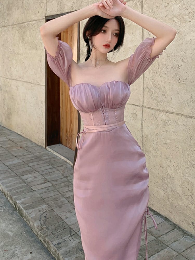 New Summer Fashion Women's Dress Elegant Satin finish Off Shoulder Bubble Sleeves Purple Irregular Midi Sexy Dress , French Romantic Party Dress Strapless Sweet Hot Sexy Korean Women Purple Bandage Irregular Long Maxi Dresses