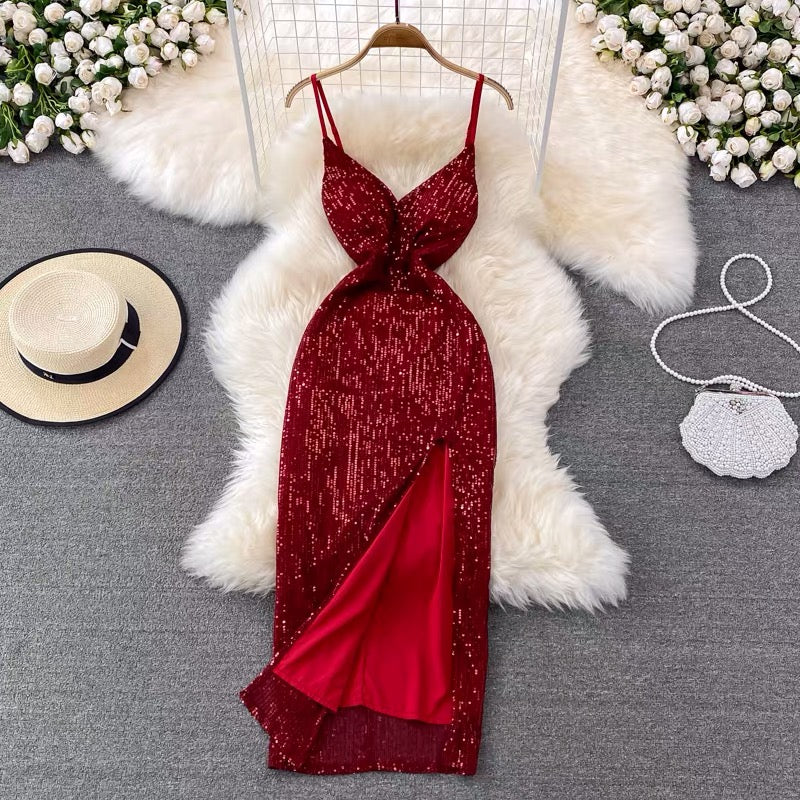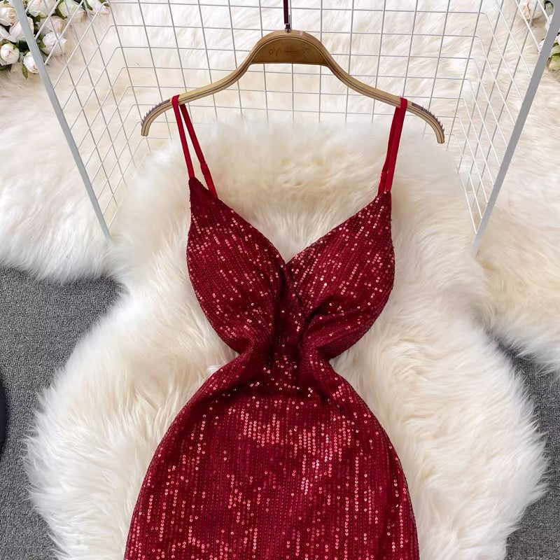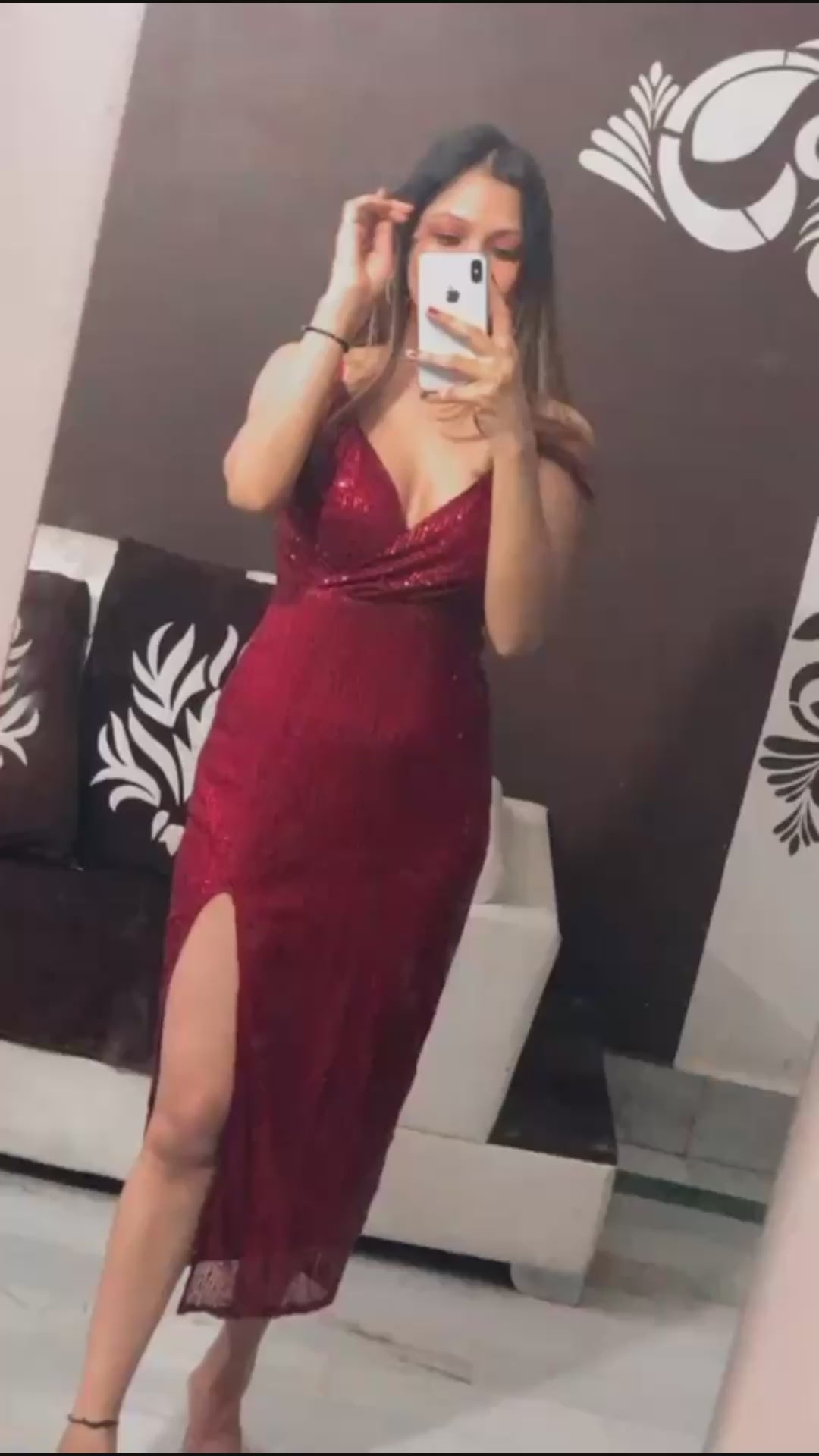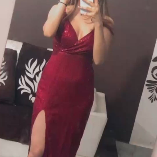 Look dazzling in the Maria Sequin Shiny Slit Dress. Glam up your wardrobe with this stunning midi dress, made with striking sequin detailing to make you feel like a star. The padded v-neck design, slit skirt and red colour create the perfect party wear look.